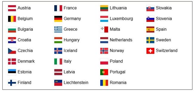 서유럽: 프랑스, 독일, 이탈리아, 스페인, 포르투갈, 스위스, 리히텐슈타인, 오스트리아, 벨기에, 네덜란드, 룩셈부르크
