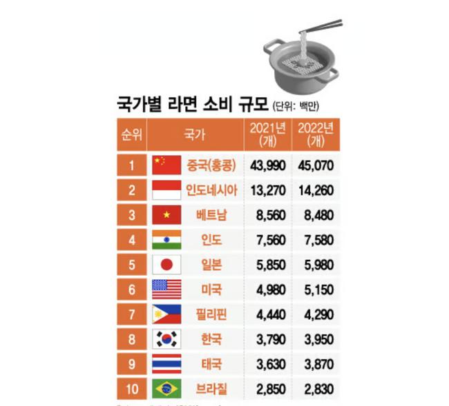 한국이 지난해 1인당 79개의 라면을 소비하며 세계에서 두 번째로 라면을 많이 먹는 나라로 나타났다.세계인스턴트라면협회(WINA)에 따르면 1인당 라면 소비 1위는 81개를 기록한 베트남이 차지했다.베트남과 한국에 이어 태국(57개), 네팔(54개), 인도네시아(52개), 일본(47개), 말레이시아(47개), 대만(40개), 필리핀(39개), 중국(홍콩 포함·31개) ...