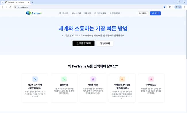 신규 서비스 'ForTransAI'는 글로벌 시장 진출을 준비하는 기업 및 대규모 콘텐츠를 운영하는 조직을 위해 설계된 대용량 AI 번역 플랫폼으로,  엑셀 파일을 통째로 업로드해 다양한 언어로 한 번에 번역할 수 있으며, 번역 결과 역시 엑셀 파일로 다운로드가 가능해 실무 적용이 용이하게 개발됐다. 특히 번역 관련 보유 특허가  적용되었으며 다년간의 실무 현장의 니즈를 시스템에 서비스에 적용해 대량의 번역 실무에 대응 가능한 형태로 개발됐다.