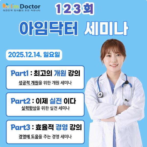병원 개원을 준비 중인 예비 개원의와 병원 운영 중인 의료진을 위한 맞춤형 정보와 실전 솔루션을 제공하는 전문 세미나가 열린다. 의사 커뮤니티 ‘아임닥터’가 주최하고 의료건강전문매체 메디컬투데이가 후원하는 ‘제123회 아임닥터 세미나’가 오는 12월 14일 서울 강남구 아이파크타워 3층에서 개최된다.아임닥터 세미나...