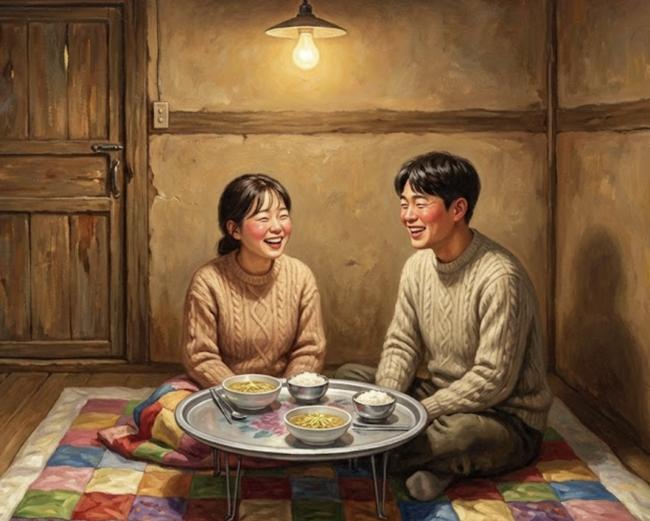 상에 마주 앉아 둘이 키득 키득, 두 얼굴이 볼그레 불그레 키득 키득